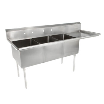 18GA Compartment Sinks, 3-Bowl, 1 Drainboard, 14″ Deep Bowl (E-SERIES) – 24″ x 24″ x 14″ – RH – 24″