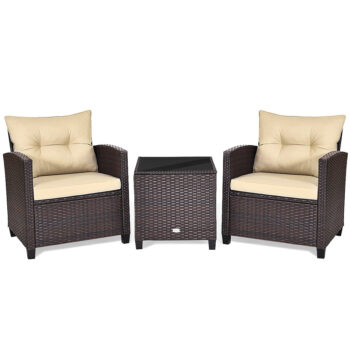 Unwind in comfort with the 3-Piece Rattan Patio Furniture Set. This durable set features a sturdy steel frame and hand-woven rattan for years of enjoyment. The wide armrests and thick, soft cushions provide ample support, while the removable cushion covers make cleaning a breeze. The tempered glass top table adds a touch of elegance, and the raised feet on the sofa and table ensure stability. Whether you're hosting a gathering or simply relaxing in your backyard, this set is the perfect addition to your outdoor space.
