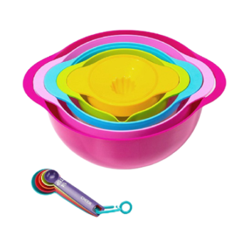Add fun, cheerful colors and functionality to your kitchen with the Cheer Collection 10-Piece Nested Bowl Set. This versatile prep and cooking set includes everything you need to mix, strain, sieve, and measure in style! The space-saving nested design makes for easy storage when you’re finished and is also convenient for use in small kitchens, dorm rooms, camping, RV trips, and more. Makes a great housewarming gift.