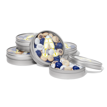 A new way to say cheers is with these silver favor tins. Featuring two glasses on the outside and your personally created M&M’S® chocolate candies on the inside, you may just feel inclined to give a speech about how much you love this coupling.