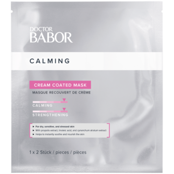 The CALMING CREAM COATED MASK provides fast, restorative relief for sensitive skin that tends to get irritated quickly. The Cream Coated Mask is particularly suitable for dry, stressed skin. It contains soothing and nourishing propolis extract, almond oil, and shea butter. The CALMING CREAM COATED fleece mask inspires with its blend of active ingredients for more sensitive, dry, and stressed skin. Cynanchum atratum extract soothes the skin, alleviates mild redness, and supports the skin’s natural protection barrier. The perfectly coordinated combination of propolis extract, almond oil, and shea butter boost skin regeneration and make the skin look more balanced, relaxed, and perfectly nourished. Moreover, hyaluronic acid provides moisture for dry, tight skin.Dry, depleted skin is perfectly nourished, slight redness and irritation are reduced, and the skin is soothed, balanced, and groomed. The active ingredient blend of propolis extract, almond oil, and shea butter boost skin regeneration. Combined with Cynanchum atratum extract, which helps soothe depleted, delicate skin, alleviates mild redness, and promotes strengthening of the skin barrier, the mask provides balance for sensitive, stressed skin. The result: Soothed and nourished skin – irritation is reduced.
