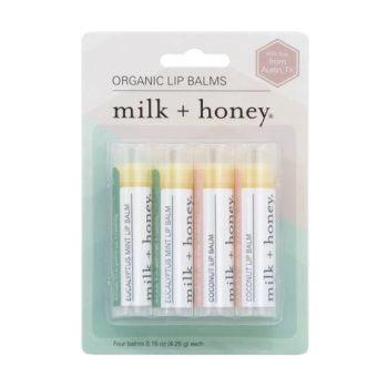 Description Milk and Honey Lip Balm 4-Pack supports lip hydration with this delicious lip balm. Made with the highest quality, certified organic ingredients. Vitamin E moisturizes, beeswax gently conditions and calendula helps to nourish. It’s so good for you, it’s addicting. Organic Coconut Flavor: A delicious, creamy scent that comforts and calms. Organic Peppermint Oil and Organic Eucalyptus Leaf Oil: A refreshing scent that reinvigorates and soothes. Pack includes Coconut Lip Balm (2) and Eucalyptus Mint Lip Balm (2) BENEFITS • Non-toxic, safe, effective • Cruelty-free • Gluten-free • Paraben-free • Esthetician-approved • No fillers • No artificial colors • Artificial fragrance-free Size: 4.25g each You might also like: Milk and Honey Lip Butter Milk and Honey Intense Hydration Cream See more Lip Balms How to Use Apply as needed. For adults only. Ingredients Coconut: Organic Helianthus Annuus (Sunflower) Seed Oil, Organic Cera Flava (Beeswax), Organic Cocos Nucifera (Coconut) Oil, Organic Coconut Flavor, Organic Vanilla Flavor, Mixed Tocopherols (Vitamin E), Organic Rosmarinus Officinalis (Rosemary) Leaf Extract, Organic Calendula Officinalis (Calendula) Flower Extract. Eucalyptus Mint: Organic Helianthus Annuus (Sunflower) Seed Oil, Organic Cera Flava (Beeswax), Organic Cocos Nucifera (Coconut) Oil, Organic Mentha Piperita (Peppermint) Oil, Organic Eucalyptus (Eucalyptus globulus) Leaf Oil, Vitamin E (Tocopherol), Organic Rosmarinus Officinalis (Rosemary) Leaf Extract, Organic Calendula Officinalis (Calendula) Flower Extract. Brand Bio milk and honey is organic, luxurious, and effective.