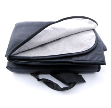 This versatile two-sided outdoor throw blanket has soft fleece on one side and smooth black nylon on the other side. Has an attached carry handle that makes the blanket easy to fold up and transport. Great for the stadium as a seat cushion or opens up to use as a blanket; also perfect for the park when the grass is wet.