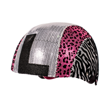 Raskullz Glam Gear Helmet with silver and pink leopard sequins is good for ages 5 and up. It complies with US ASTM and CPSC standards for bicycle helmets. For maximum protection, this helmet must be fitted and attached properly to the wearer's head in accordance with the fitting instructions.