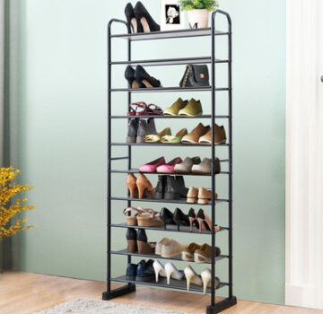 Introducing a new way to keep your shoes organized and within reach: this 10-tier shoe organizer rack! Made of premium pp and metal materials, it is sturdy and durable. Its extended base offers extra stability, allowing it to stand freely on any floor surface. Additionally, its shelves are made of waterproof material, making them easy to clean. Now you can keep your shoes in perfect order with this innovative product!